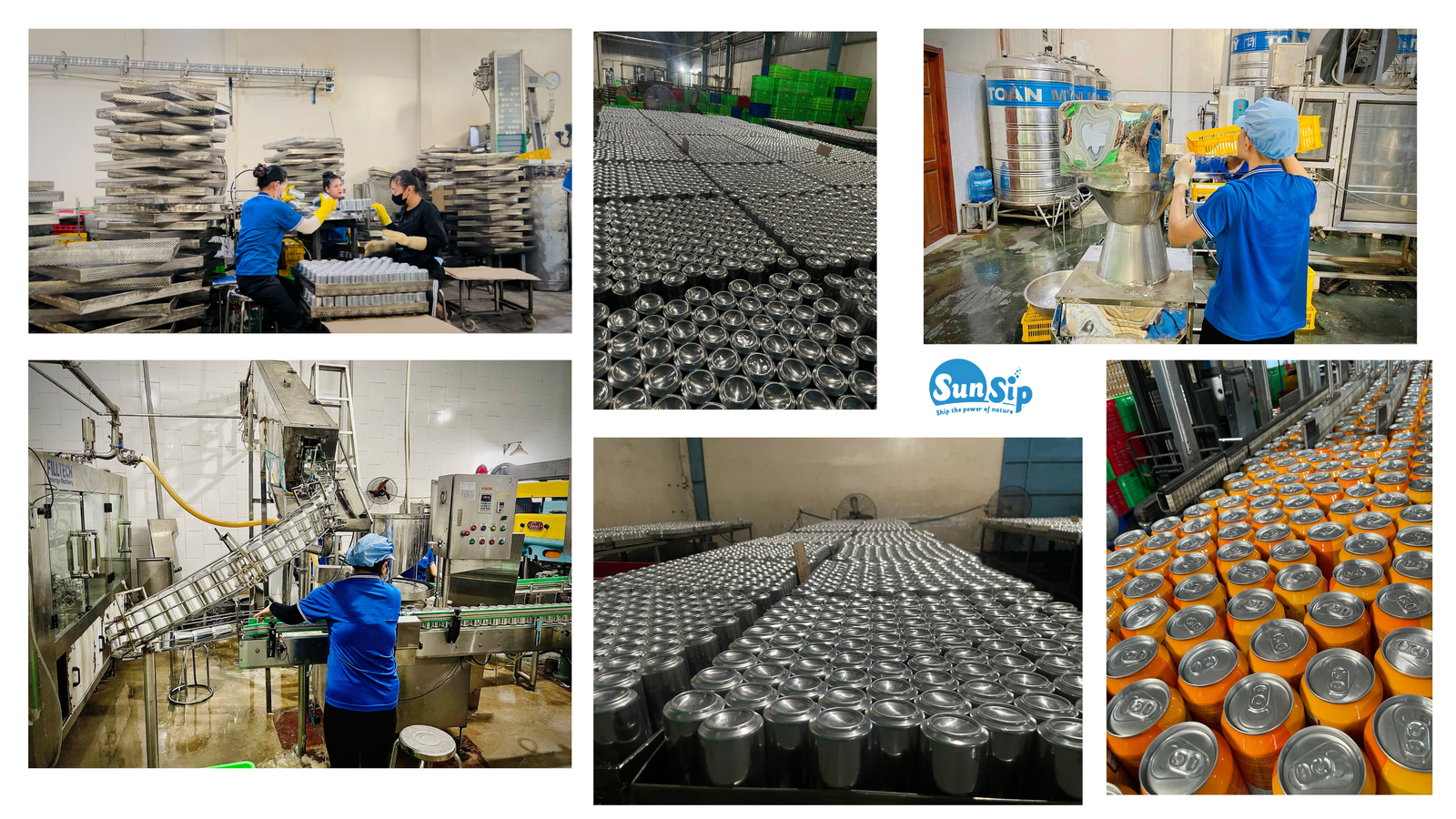 Sunsip Beverages VIET NAM operates a modern, internationally certified beverage mfaanucturing facility designed to ensure high quality, safety, and efficiency. Here’s an overview of their production process: Selected from trusted local farms, including fresh coconut, aloe vera, and tropical fruits. Ingredients are processed using modern technology to preserve natural flavor and nutrients. Each step is carefully monitored to meet ISO, HACCP, and FSSC standards. Products are packed in PET bottles, aluminum cans, and cartons using fully automated lines Each step is carefully monitored to meet ISO, HACCP, and FSSC standards.Modern Production Line