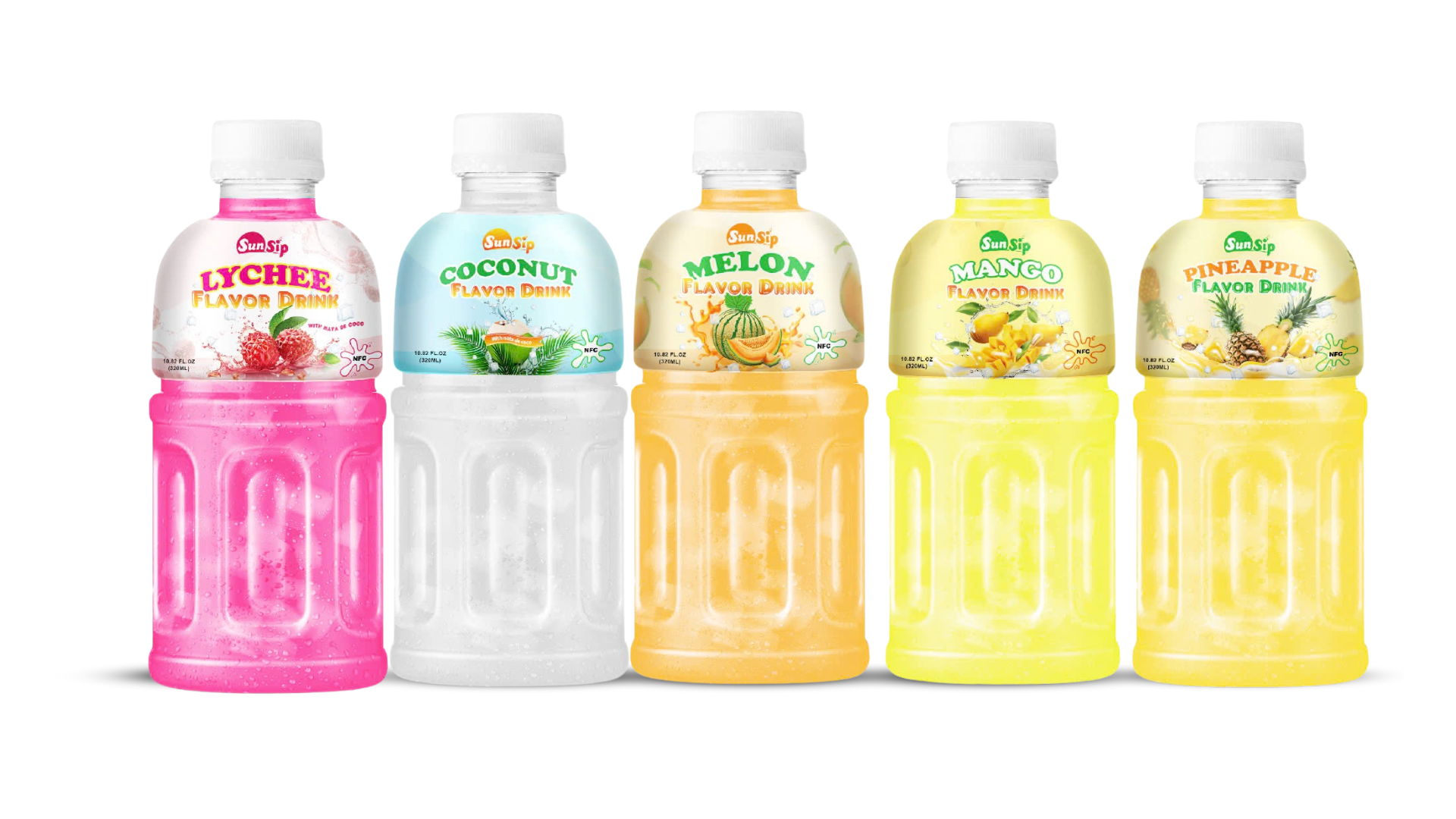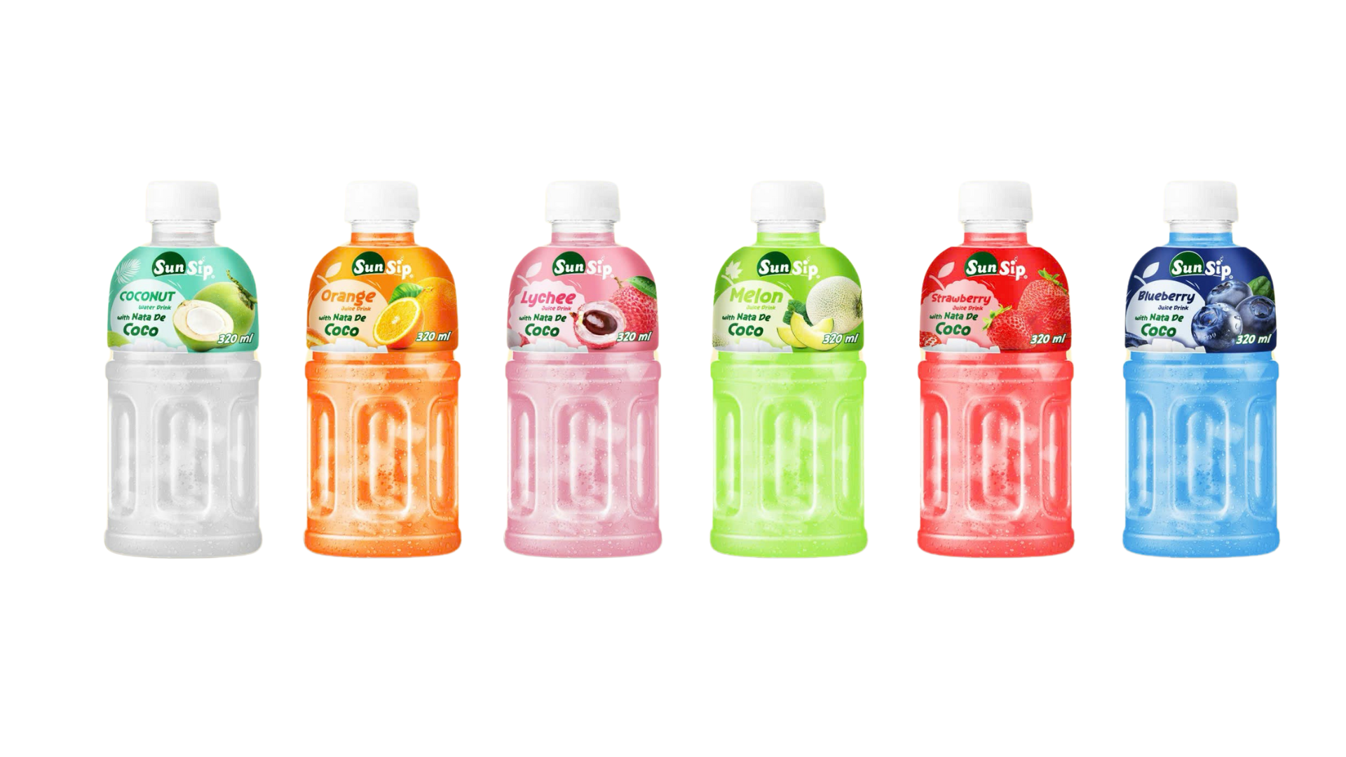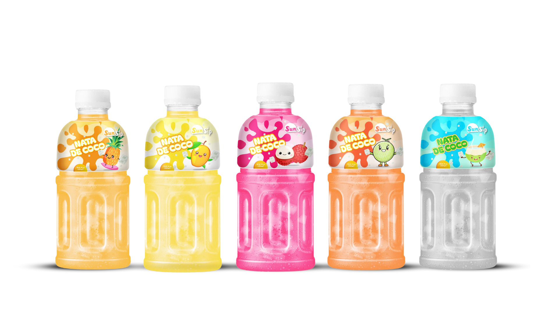 SunSip Nata de Coco in 330ml and 500ml PET bottles is a refreshing fruit juice drink with chewy coconut jelly, ideal for OEM and private label projects.