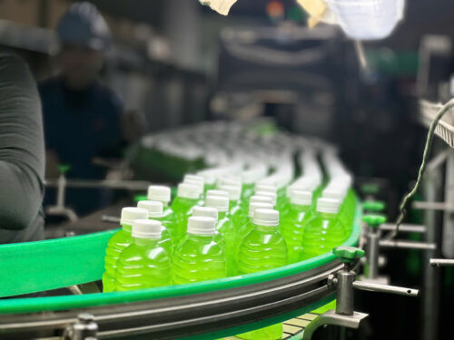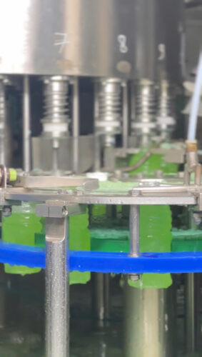 • Image 1: Green bottles moving along the conveyor — post-filling, pre-labeling